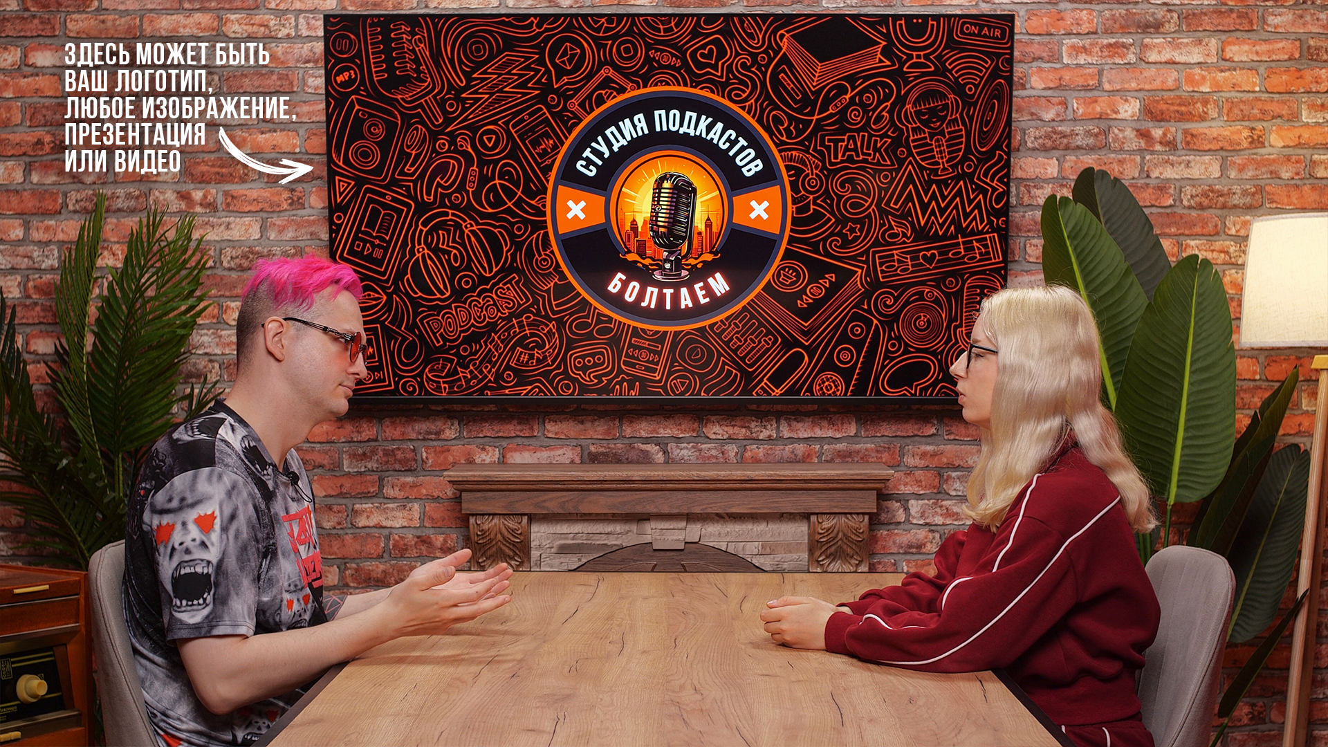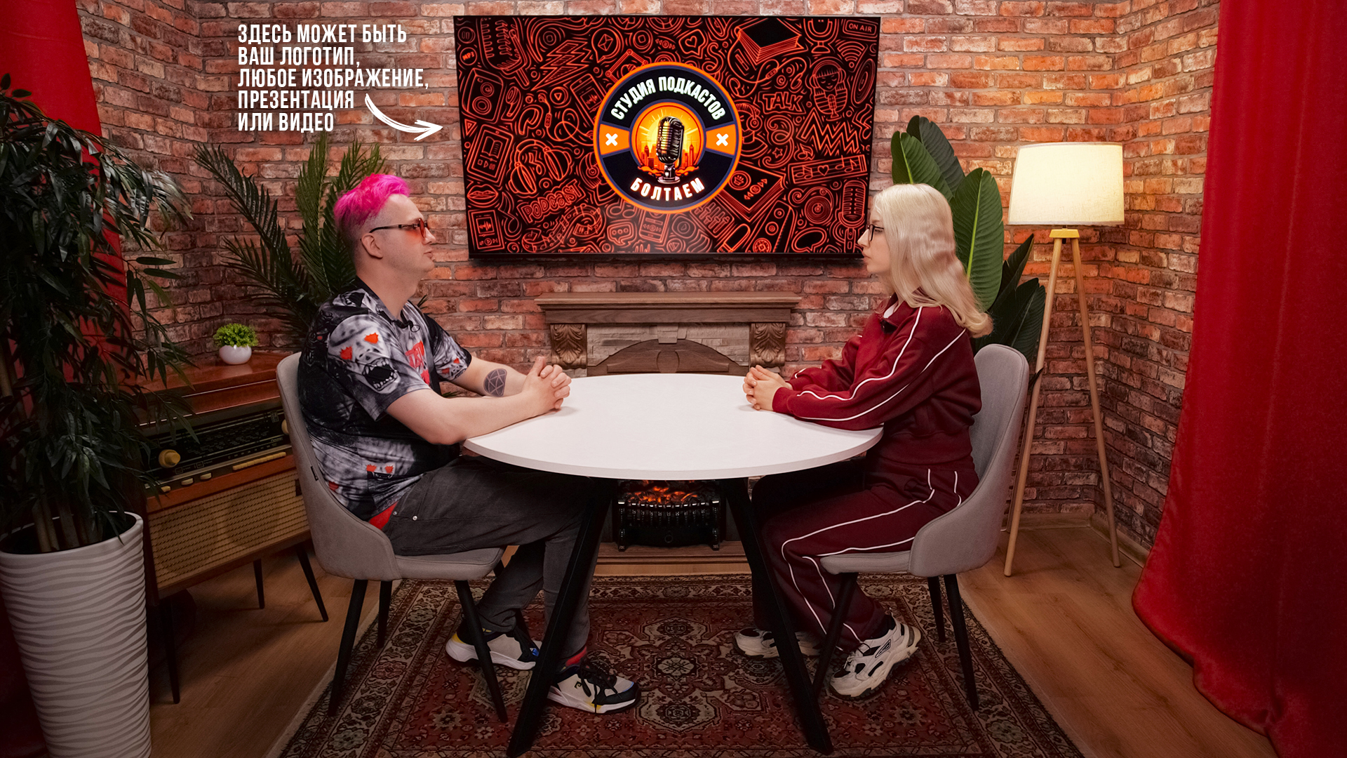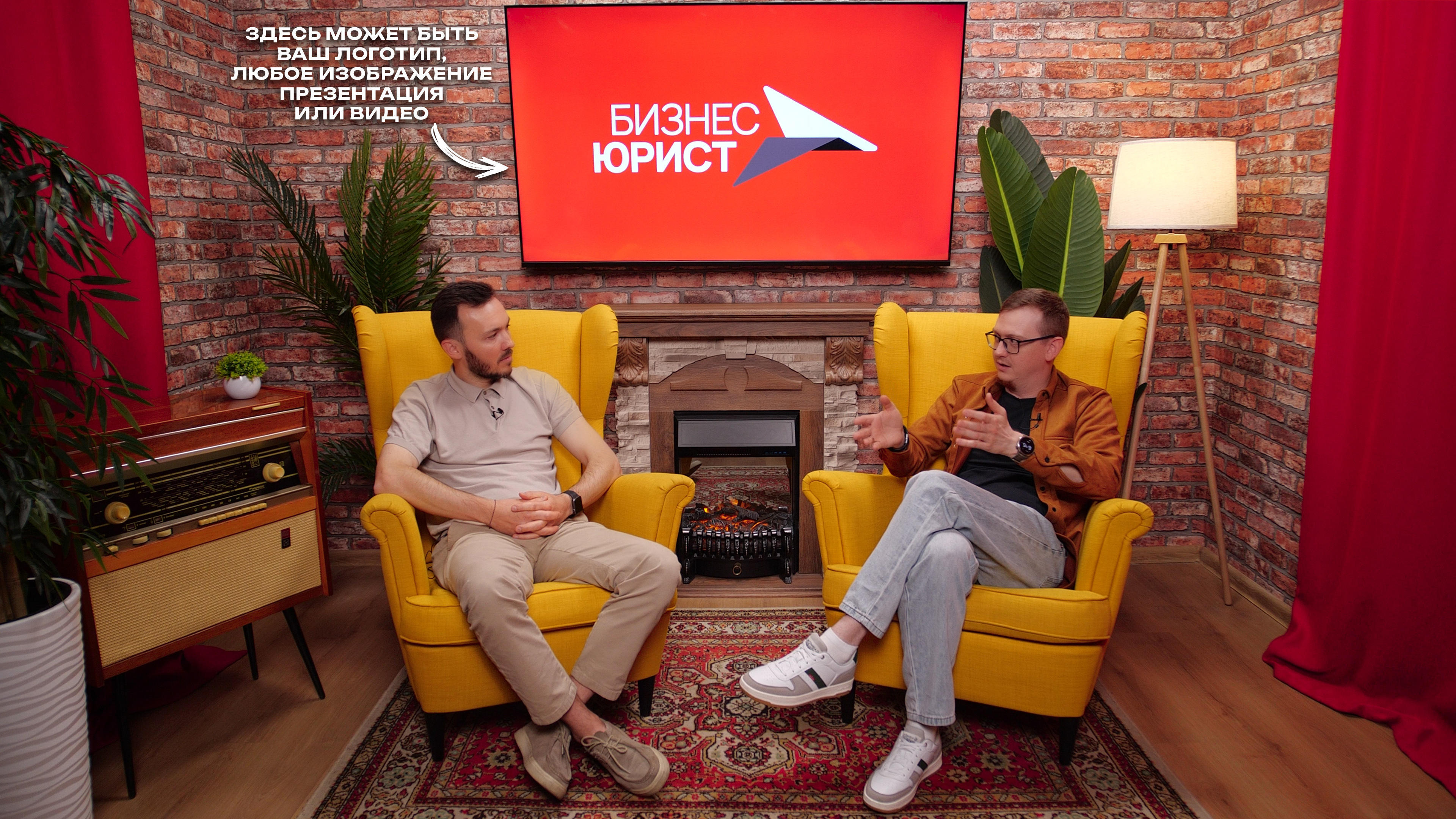 Кирпичные стены, камин для уюта и телевизор 🔥 на который можно вывести ваш логотип, любое изображение, презентацию или видео